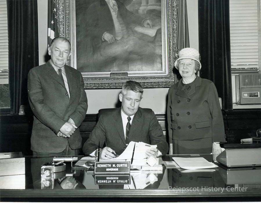 B/W photo of Sheldon Christian of Brunswick, Governor of Maine, Kenneth Curtis, and unidentified woman. No date.