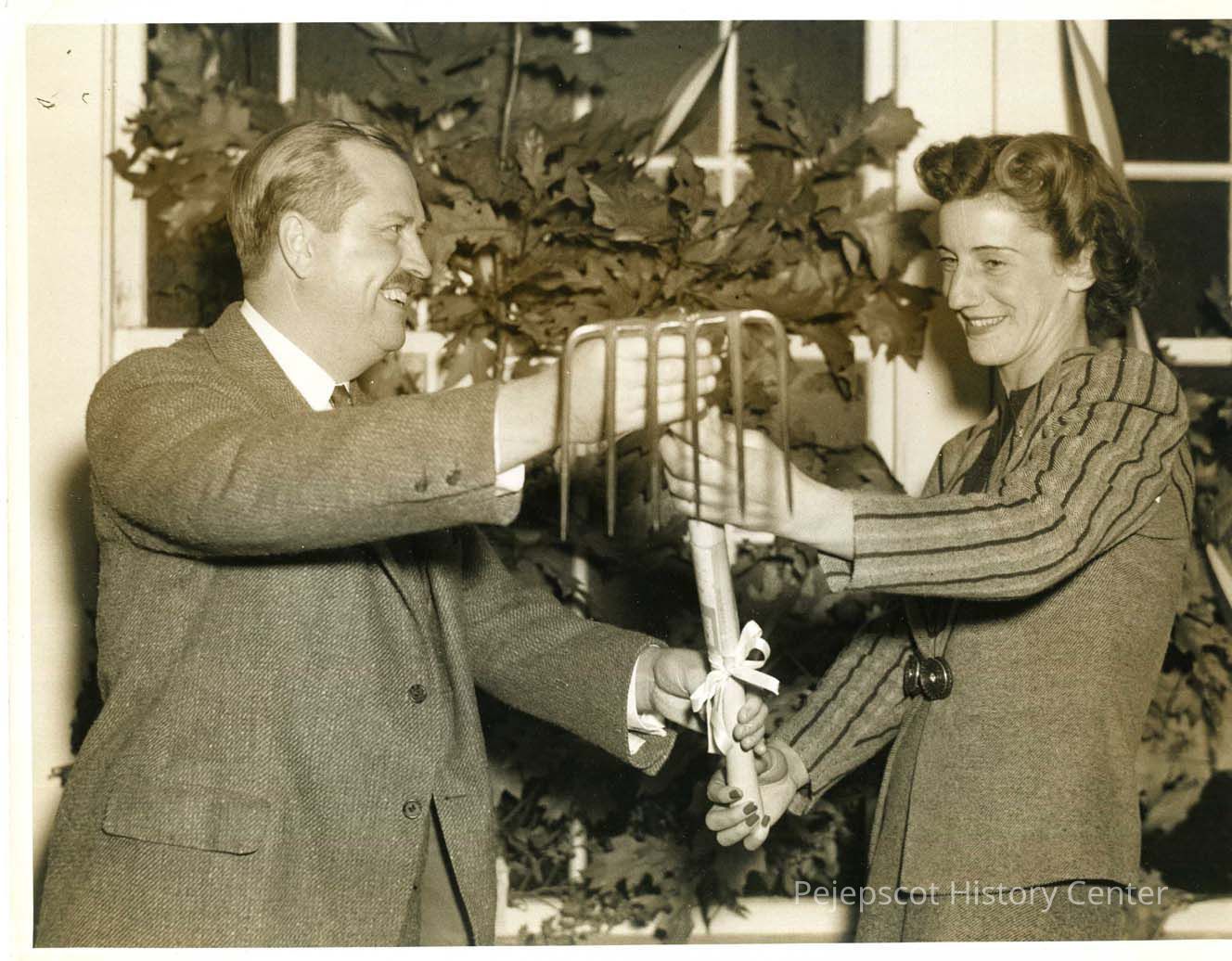 Sumner Sewall, governor of Maine, holds a beribboned clamming hoe with a lady. Undated