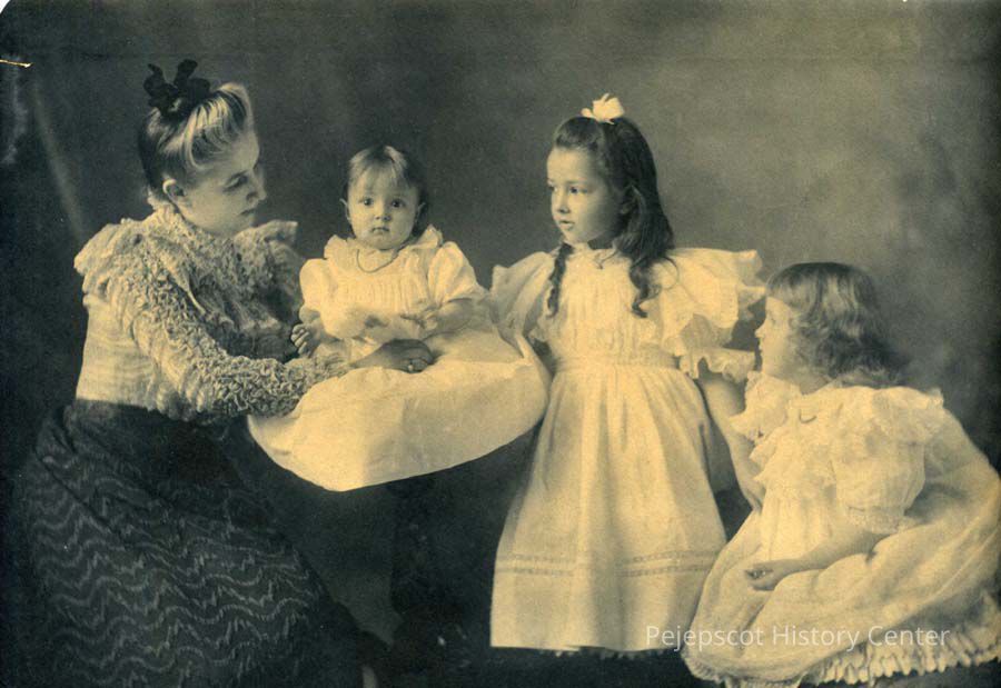 B/W photo of Grace Chamberlain Allen and daughters, Rosamond Allen, Eleanor Allen, and Beatrice Allen. 1899.