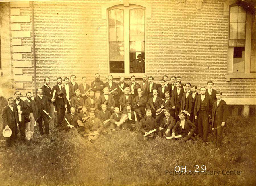 An undated B/W photograph of a graduating Class of Maine Medical School. Outside Adams Hall (?)