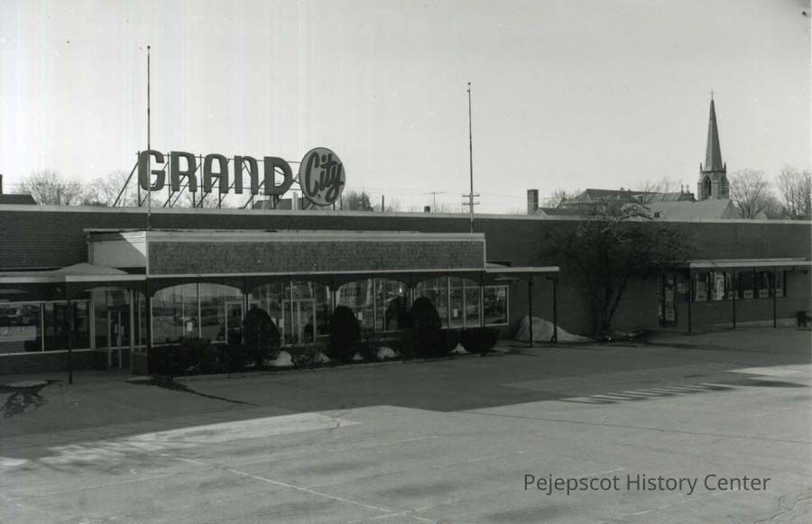 A B/W photograph of the Grand City & Shop N Save Drugs after they vacated the building on Railroad Avenue. St. John's Church Steeple can be seen in the background. Spring 1994