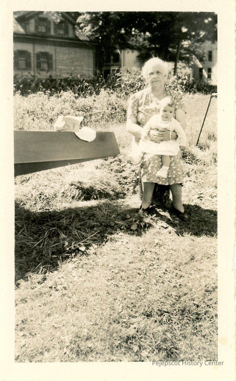 A 2.25" x 4" sepia-toned photograph of an older woman in a patterned dress holding an infant in her lap while seated outside a home during high summer.