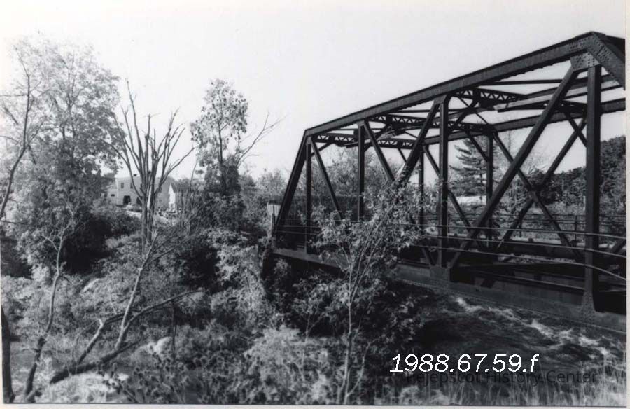 An undated black and white photo of the discontinued Granny Hole Stream Bridge in Topsham. The bridge crossed the "stream," a hand-dug canal that created water power for the Bowdoin, later Pejepscot, Paper Mill. The photo is looking northeast. The paper mill closed in 1985.Collection