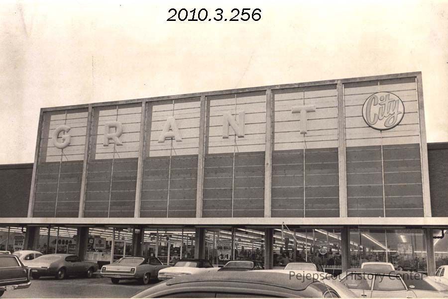 A B/W photograph of the Grant City store front and sign. W. T. Grant Co. has announced that it's store has officially changed it's name to "Grant World." This photo was published on 3/12/1973. Undated