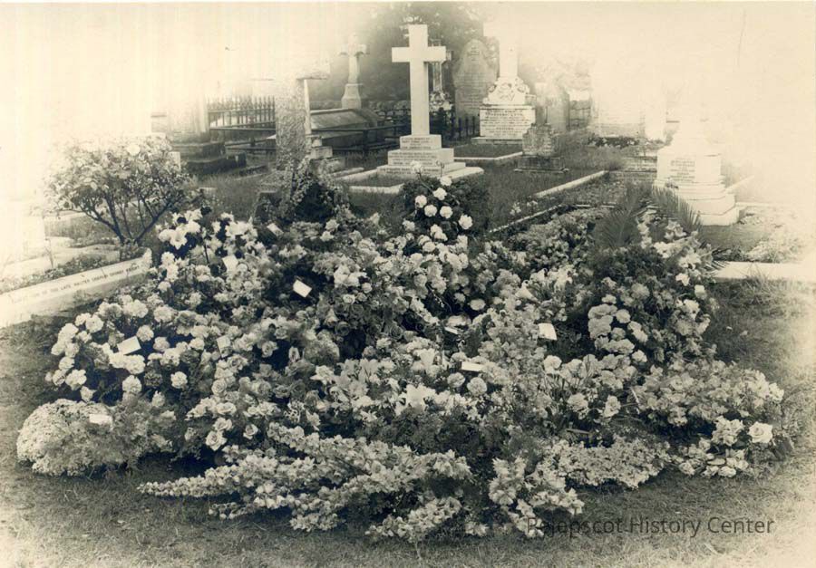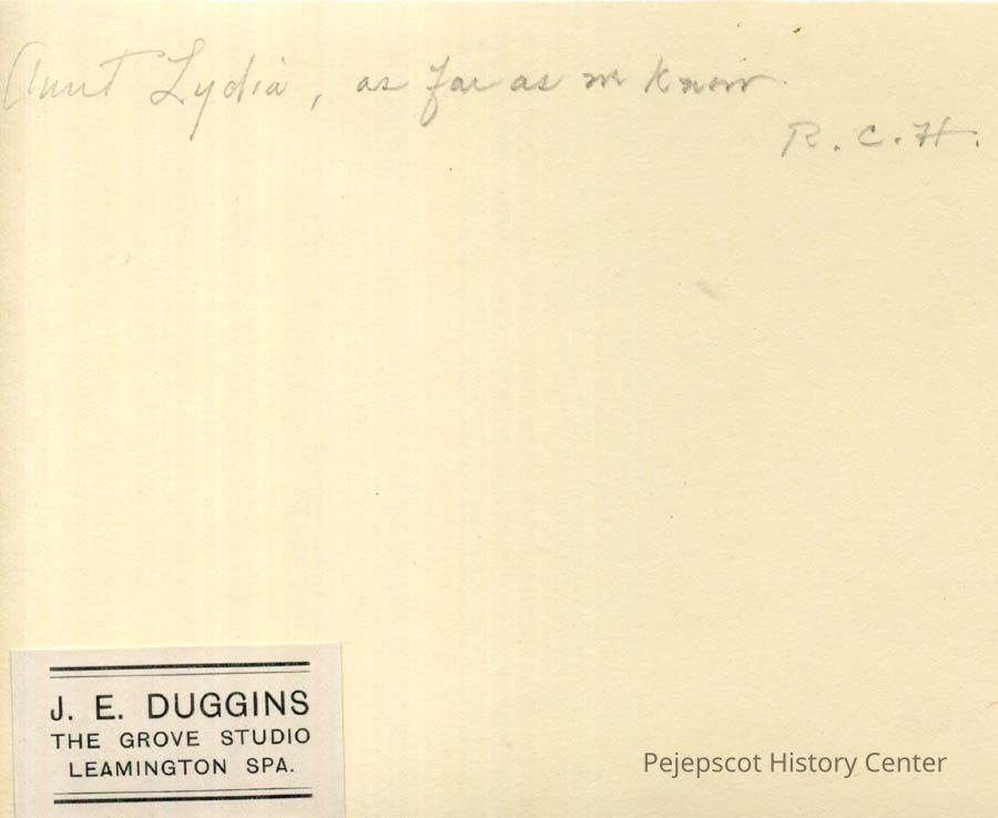 An undated black and white photograph of a grave with flowers surrounding the burial box and a cross on top of it. Writing on the back says "Aunt Lydia, as far as we know. R.C.H." There is a label on the bottom indicating that the photo was taken by J. E. Duggins, The Grove Studio, Leamington Spa.