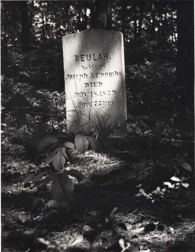 A B/W photograph of a gravestone off Adams Road. The stone is for Beulah Coombs. Undated