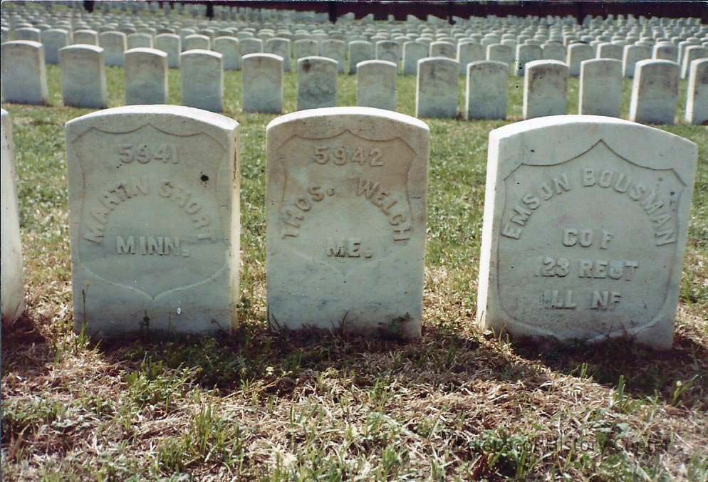 A B/W photograph of the gravestone of Tommie Welch, of the 20th Maine Rgt. at Andersonville National Cemetery in Georgia. The 20th Maine Rgt. was the Maine volunteer Union Army during the Civil War. Undated.