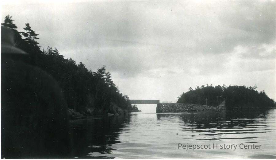 An undated black and white photo looking south from Lamba's Hole, looking toward strait connecting the hole with Gun Point Cove as well as the bridge and causeway connecting Great Island (on the left) with Orr's Island (on the right). Harpswell, Maine.