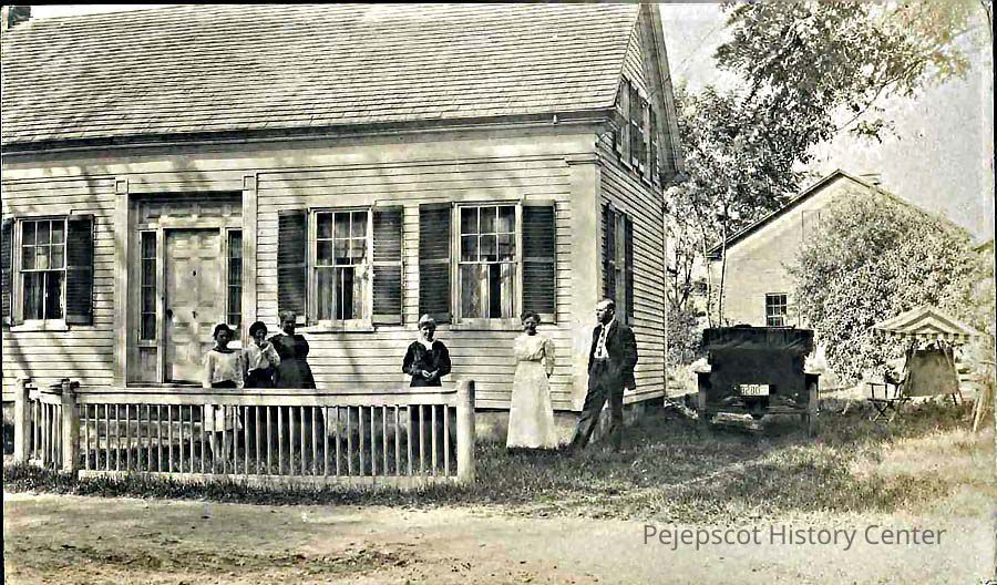A B/W photograph of a house on Green Street, Brunswick, Maine. There are six people standing in front of the house and a vehicle parked in the driveway. This house was located on the North side of the street. It is no longer extant and the site was cleared to provide a parking lot for the Hawthorne School. Undated.