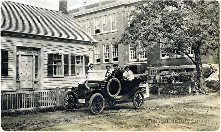 A B/W photograph of a house on Green Street, Brunswick, Maine. Five people sit in a car and a woman stands on the lawn. This house was located on the North side of the street. It is no longer extant and the site is a parking lot for the Hawthorne School, which is visible behind the house in this photo.Lexicon