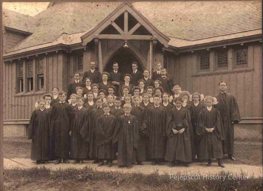 A B/W group photograph in front of the vestry door at the rear of the First Parish Church. There is a Coffin in the picture. Undated