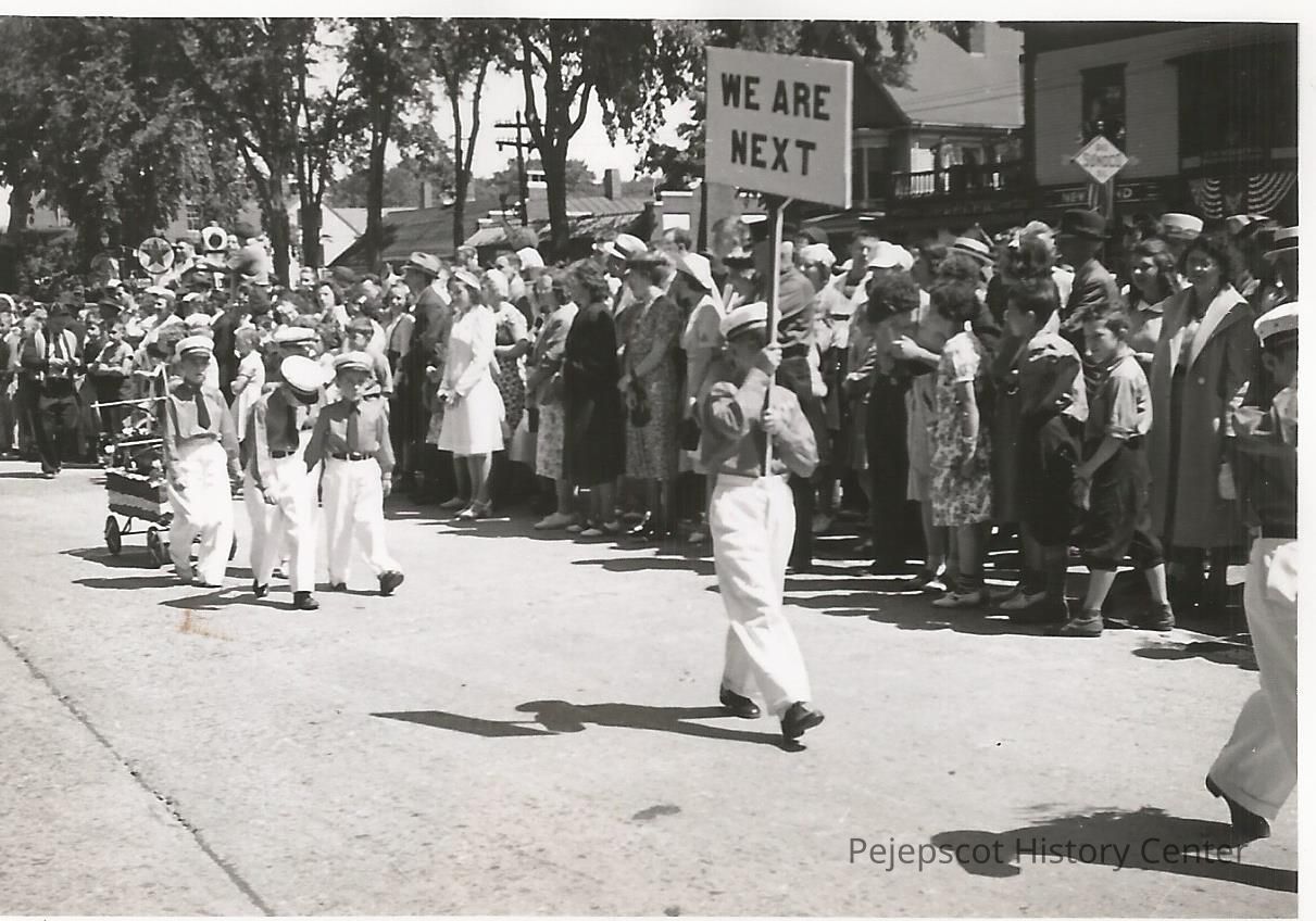 A B/W photo of a boy carrying a sign that reads, "We Are Next" in Brunswick's 200th Anniversary parade. Behind him are a similarly dressed group of boys pulling a small model fire engine. Undated
