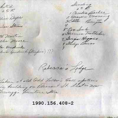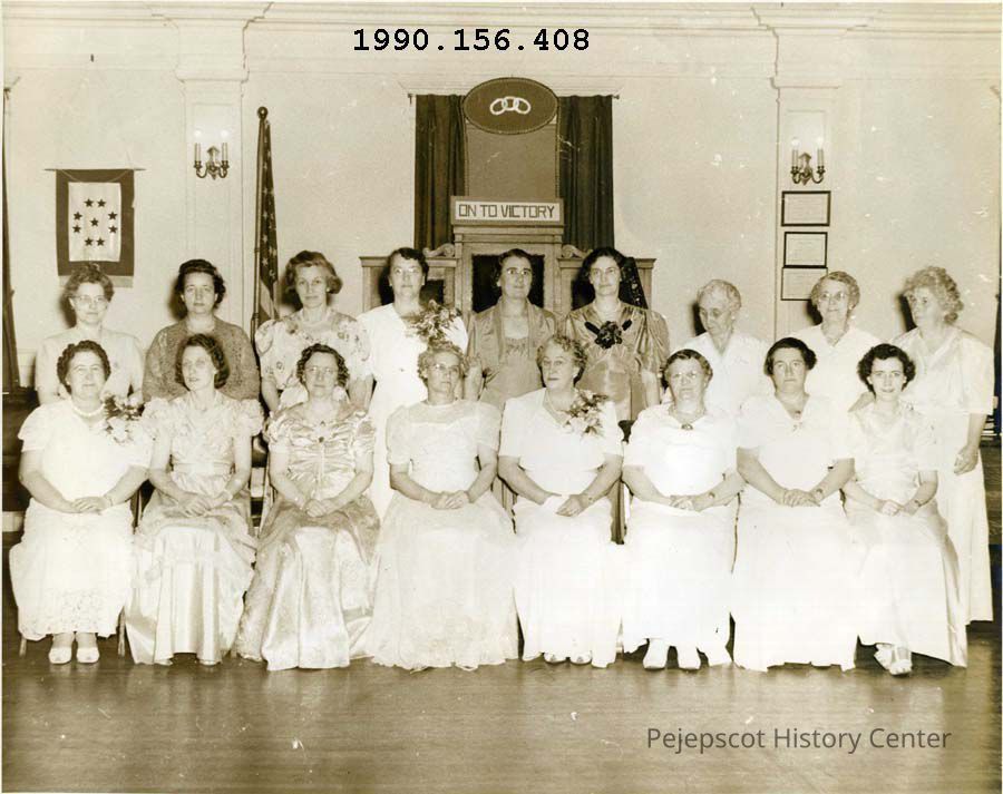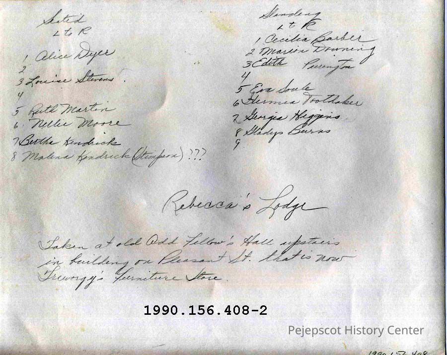 A B/W photograph of a group of Rebecca's taken at the Odd Fellows Hall upstairs on Pleasant Street that is now Treworgy's Furniture Store. Seated left to right: Alice Dyer; ?; Louise Stevens; ?; Ruth Martin; Nellie Moore; Bertha Kendricke; Malena Kendricke (Stimpson)?? Standing left to right: Cecilia Barber; Marion Downing; Edith Purington; ?; Eva Soule; Hermia Toothaker; Georgia Higgins; Gladys Burns; ?. Undated