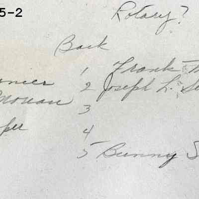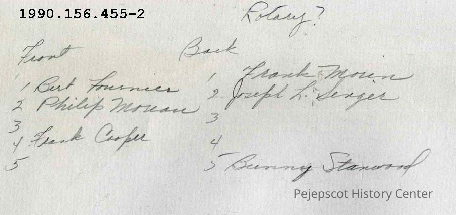 Front row: 1. Bert Fournier; 2. Philip Moreau; 3. ?; 4. Frank Cooper; 5. William Dick. Back row: 1. Frank Morin; 2. Joseph L. Singer; 3. ?; 4. ?; 5. Benny Stanwood. Undated