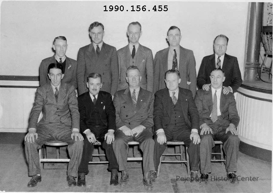 A B/W photograph of a group of men, possibly Rotary, sitting near the stage at the Old Town Hall.