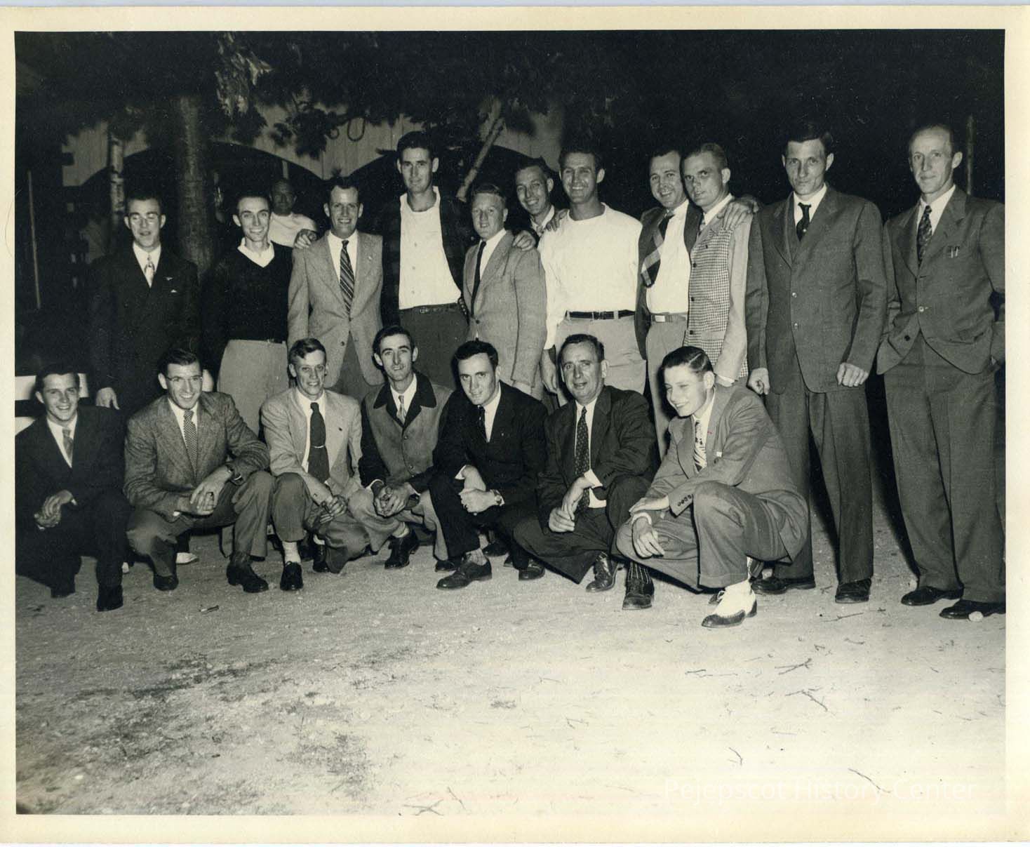 A picture of nineteen men, seven kneeling and 12 standing. In the first row are #5 Rick Anderson and #7 Neil Mahoney. In the back row are #2 Joe Gusiak, #3 Ken Brown, #4 Ted Williams, #5 Red Moens, #10 Arthur Levitt (mailman). Undated