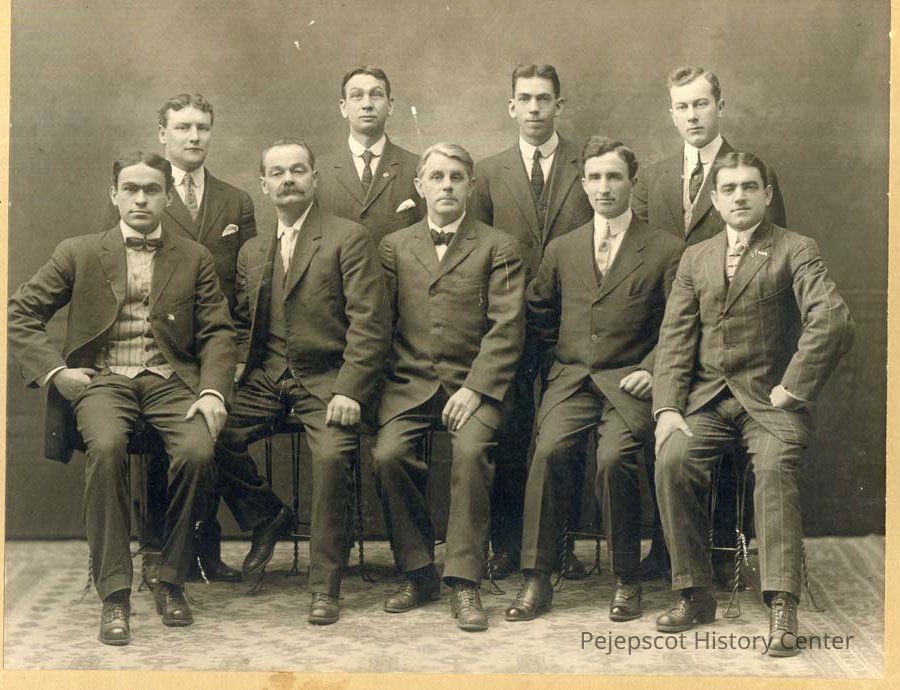 A B/W photograph of a group of men. The group is not identified, but the individuals are. Their names are written on the back. Front row l to r: Joseph Cloutier; Catlin ?; ? Desjardin; Ludger Ouellette; Michael Racine. Second Row l to r: Alfred ?; Charles Lafferty; Alfred ?; Alcide LeTarte. Undated