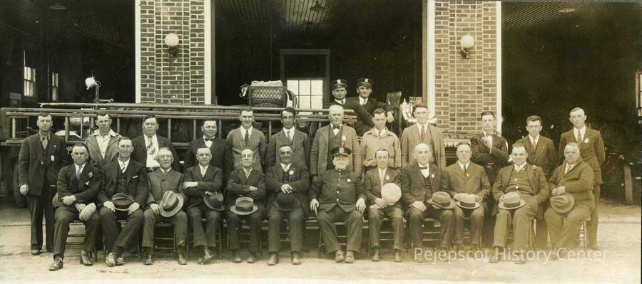 A B/W photographic view of a group of men in front of the fire house. Three are in firemen's uniform. The one in the center front is Billy Edwards. Back row: #2-Charle McEnnery; #9-Kenneth B. Knight) Same photo as 1975,2,1,4Collection