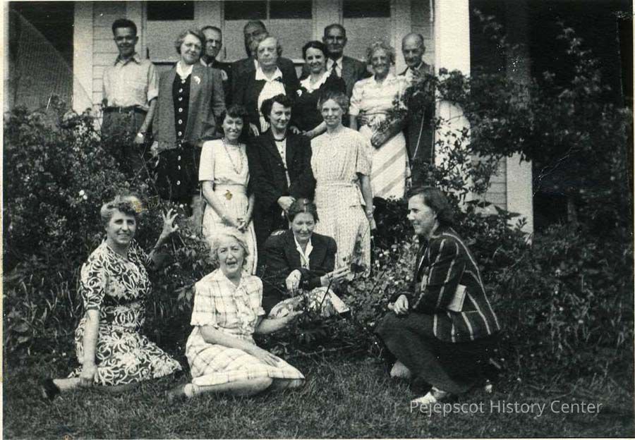 A B/W photo of a group outdoors. On back: Send telegram to Jackman Sta.-Mrs. Rossaine Plaute Operation yesterday O.K. Looking forward to seeing you soon- ill. 1st Row: Lillian Marshall, Mrs. Pennell, Helen Snow, ? 2nd Row: Annette Bonang, Rose Fournier, Hermia Toothaker. 3rd Row: Gladys Burns, Brainard Burns, Elsie Brahaut, Susie Sylvester, Mary Lilley, Howard Sylvester, Frank DeWick. Taken in Harpswell. UndatedLexicon