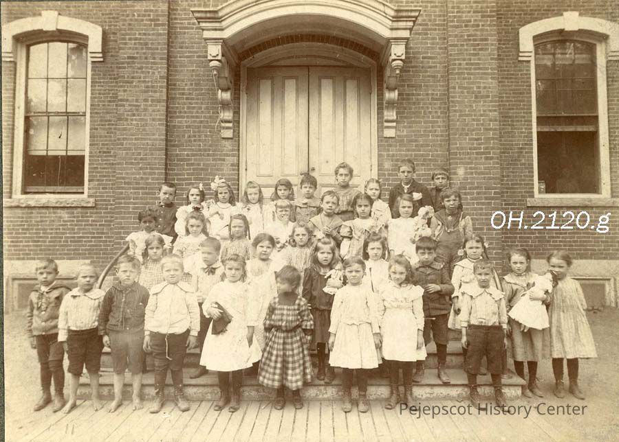 A B/W photograph of a group of Center Street school children. Some of the girls are holding dolls.