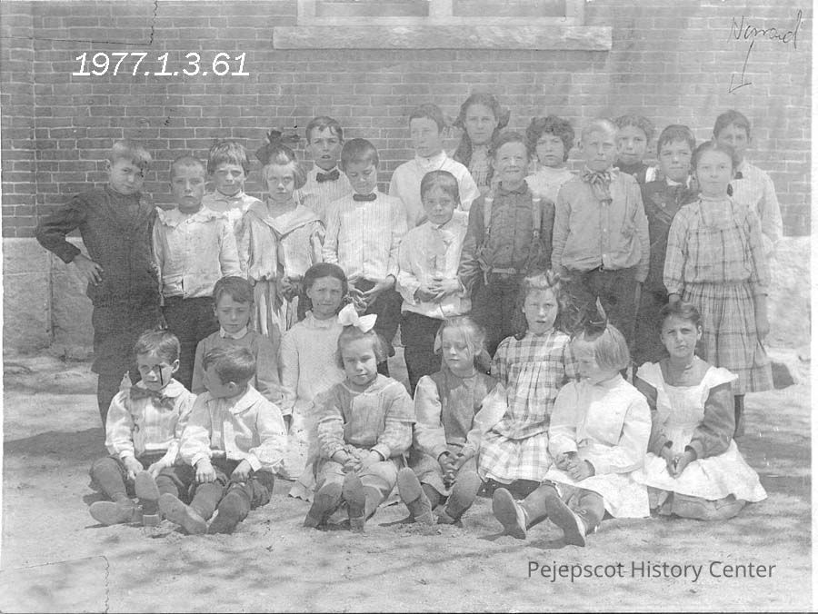 A picture postcard of a school group at Center Street School. Howard Sylvester is in the back row and is marked with an arrow. UndatedCollection