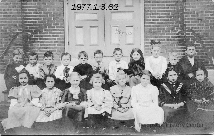 A B/W postcard picture of a group of Center Street School children sitting in front of the school. Howard Sylvester is identified with an arrow. UndatedCollection