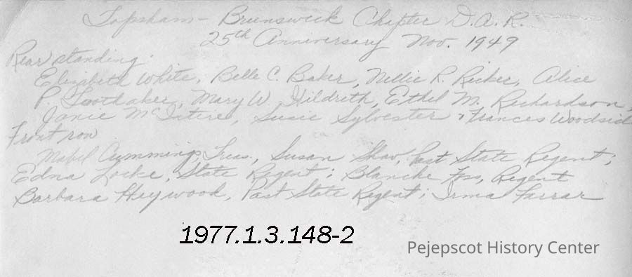 They are: Rear standing: Elizabeth White; Belle C. Baker; Nellie R. Ricker; Alice P. Toothaker; Mary W. Hildreth; Ethel M. Richardson; Janice McIntire; Susie Sylvester; Frances Woodside. Front row: Mabel Cummings, Treasurer; Susan Shaw, Past State Regent; Edna Locke, State Regent; Blanche Foss, Regent; Barbara Heywood, Past State Regent; Irma Farrar. November 1949Collection