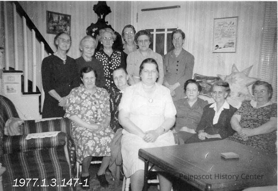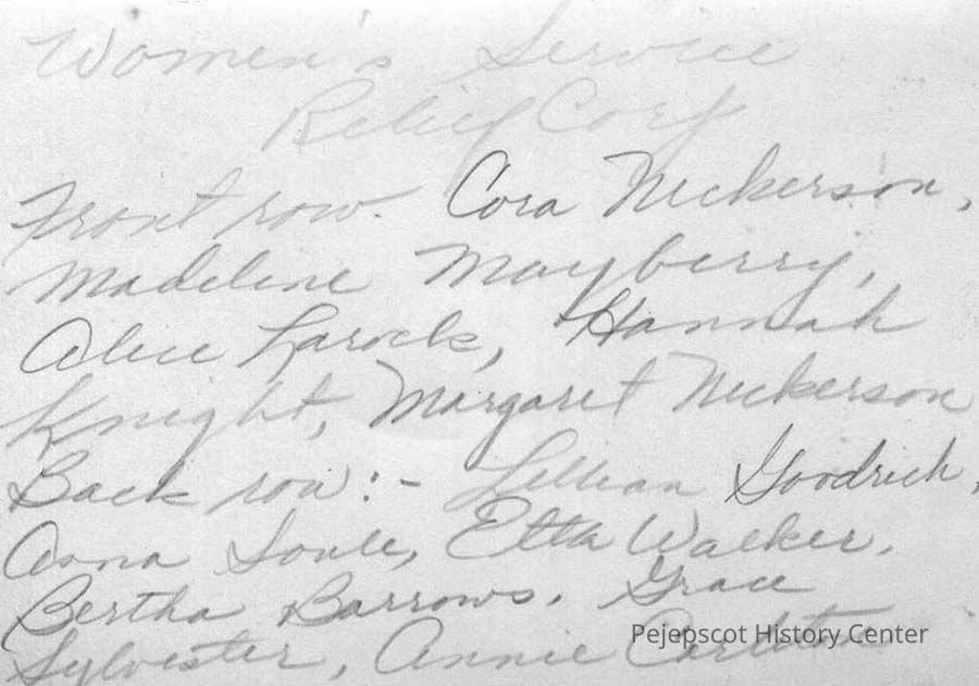 A B/W photograph of a group of women from the Women's Service Relief Corps (WSRC). They are: Front row, Cora Nickerson, Madelyn Mayberry, Alice Laroche, Hannah Knight and Margaret Nickerson. Back row, Lillian Goodrich, Anna Soule, Etta Walker, Bertha Barrows, Grace Sylvester and Annie Carleton. UndatedCollection
