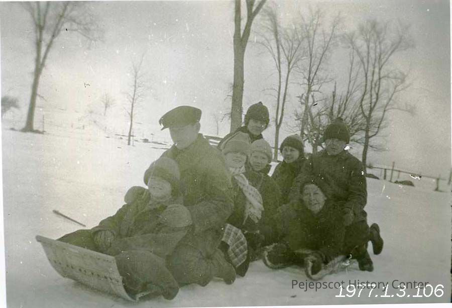 A B/W photograph of an unknown group on a toboggan. They are mostly children. The accession paper work says, "Misc. snapshots of Mrs. S. Sylvester from her early life." Undated