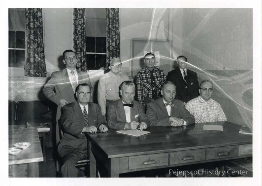 Black and white photograph of men who are spearheading a $6000 fund for the Brunswick area Student Aid Fund. Photographed are Seated: Ralph Busque, Brice Booker, George Bean, Mario Tonon, Principal. Standing: Byron Harrington, Phil Moreau, Phil Theberge and Lionel LavigneLexicon