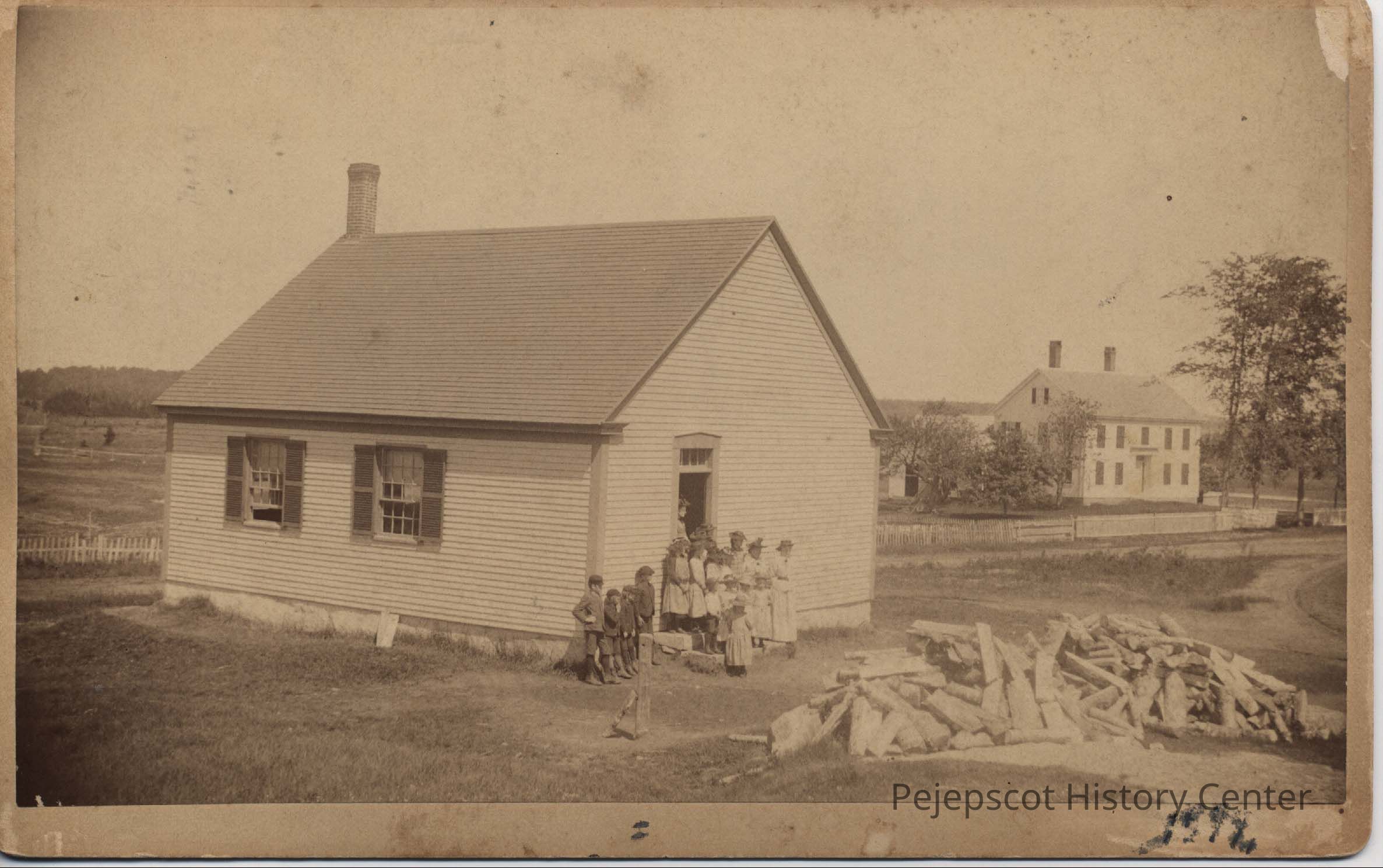 A B/W photograph of Growstown School. It shows the school house with a group of children standing in front. There is a pile of firewood in front and buildings can be seen in the background. The picture is taken looking at the left front corner of the building. Undated