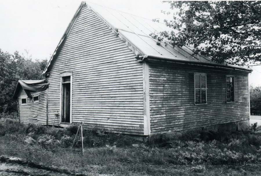 A black and white photograph of the exterior of the Growstown School in Brunswick, ME before its restoration. Dated 1973.