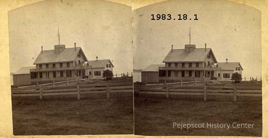 A stereopticon view of a guest house in South Harpswell(?).. Built for Baxter Marr of Lewiston, c. 18787, across road from Auburn Colony. Became "Bonanza", then Harpswell House (c. 1837), th en "Happy Thought: (1901 0r 2). Burned (unknown dae)