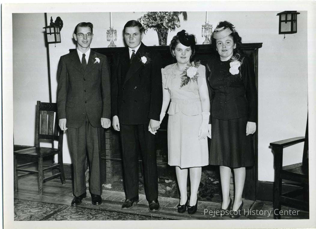 Thelma and Karl Gustafson stand in front of a fireplace with the best man(?) and maid of honor, the bride's sister, Marlene Maloon Douglas. Undated
