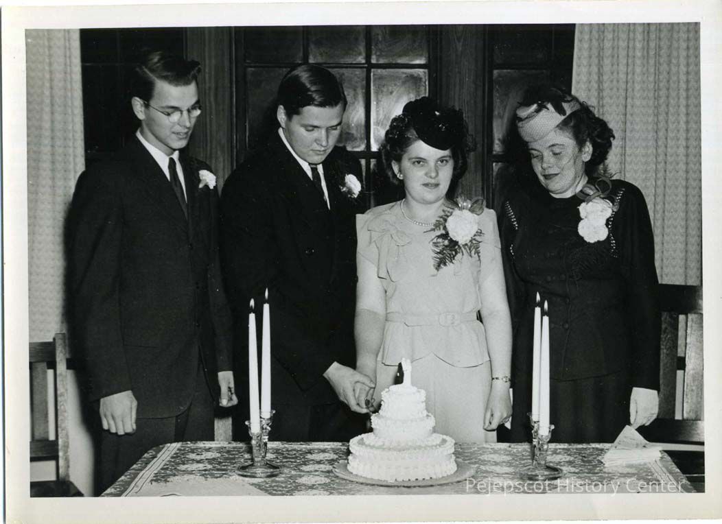 Karl and Thelma Gustafson cut their wedding cake. An unidentified man stands next to the groom and Thelma's sister Marlene Maloon (Douglas) stands next to her. Undated