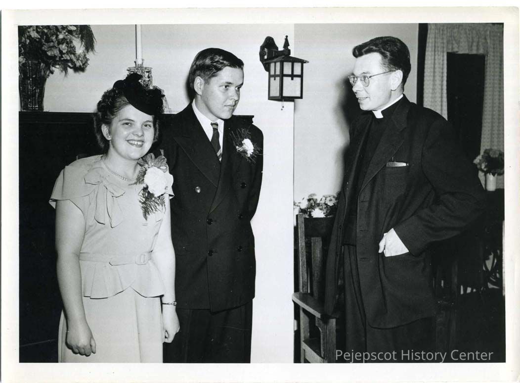 Karl and Thelma Gustafson face the unidentified minister who married them at St. Paul's. Undated