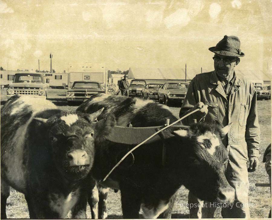 A black and white photo of Guy Rhoades, Topsham Fair cattle superintendent, driving a pair of steer owned by Dwaine Chase of Dryden at the fairgrounds, appeared in The Times Record in Brunswick, Maine, on 10/15/1976.