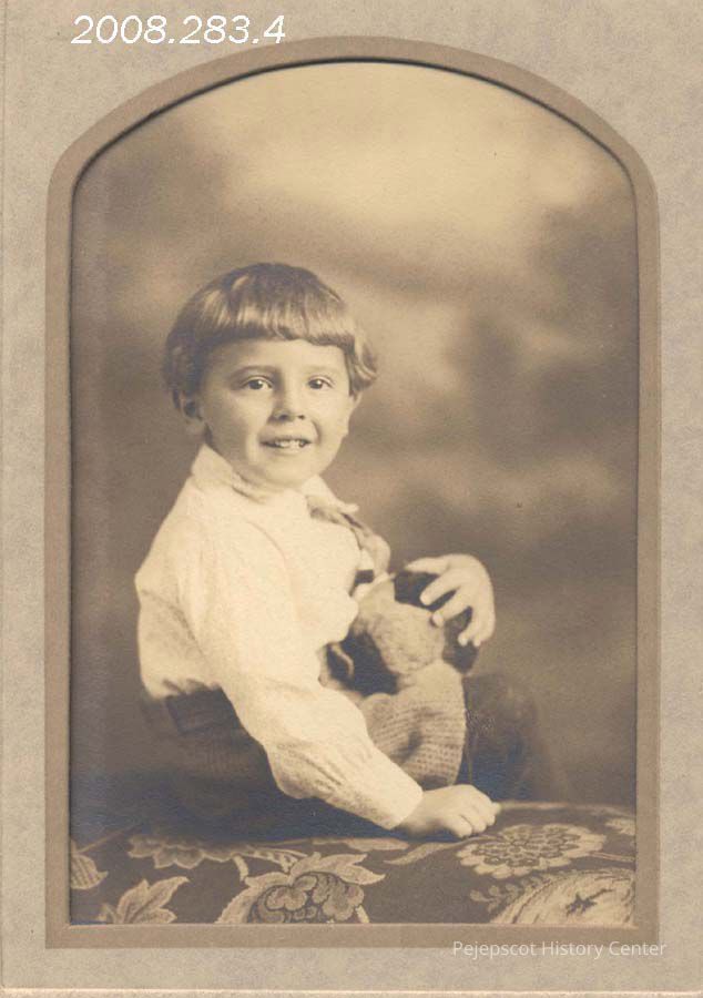 A B/W photograph of H. Linwood Sylvester as a child. He is seated and holding a teddy bear. Undated