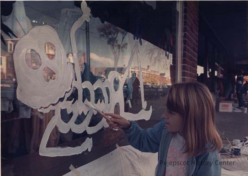 A color photograph of Lauren Seymour, a student at Jordan Acres Elementary School, painting the window of the J.J. Newberry Co. department store, Brunswick, Maine. Seymour is painting a skeleton for the Autumn/Halloween-themed window painting competition.