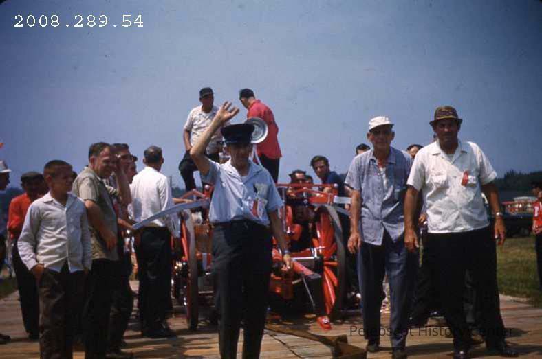A color slide of a hand pumper which was part of Topsham's Bicentennial. The slide is marked 10/1964.