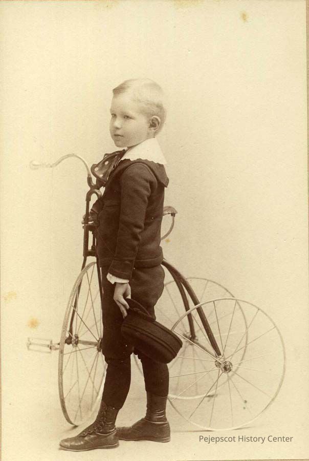 A sepia-toned photo of Harold Gay, age 5, standing next to a tricycle. Undated.