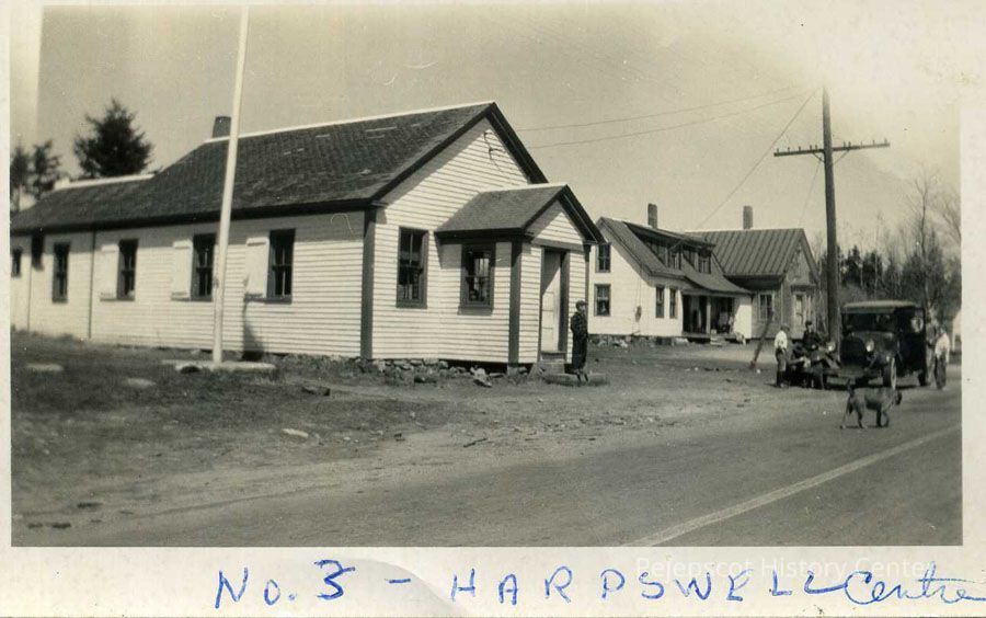 An undated black and white photograph of two structures. Writing on the photograph indicates the more prominent is No. 3, Harpswell Center. It looks to be Centennial Hall, across from Bailey's store (now the Harpswell Historical Society building) in Harpswell Center. There is a man standing on the steps of Centennial Hall.