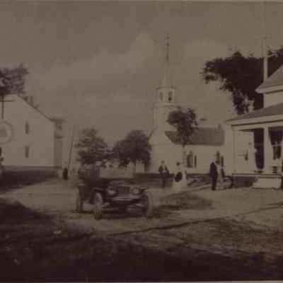 A color print copy of Harpswell Center showing the Kellogg Church, Bailey's Store and the Old Town House. UndatedCollection