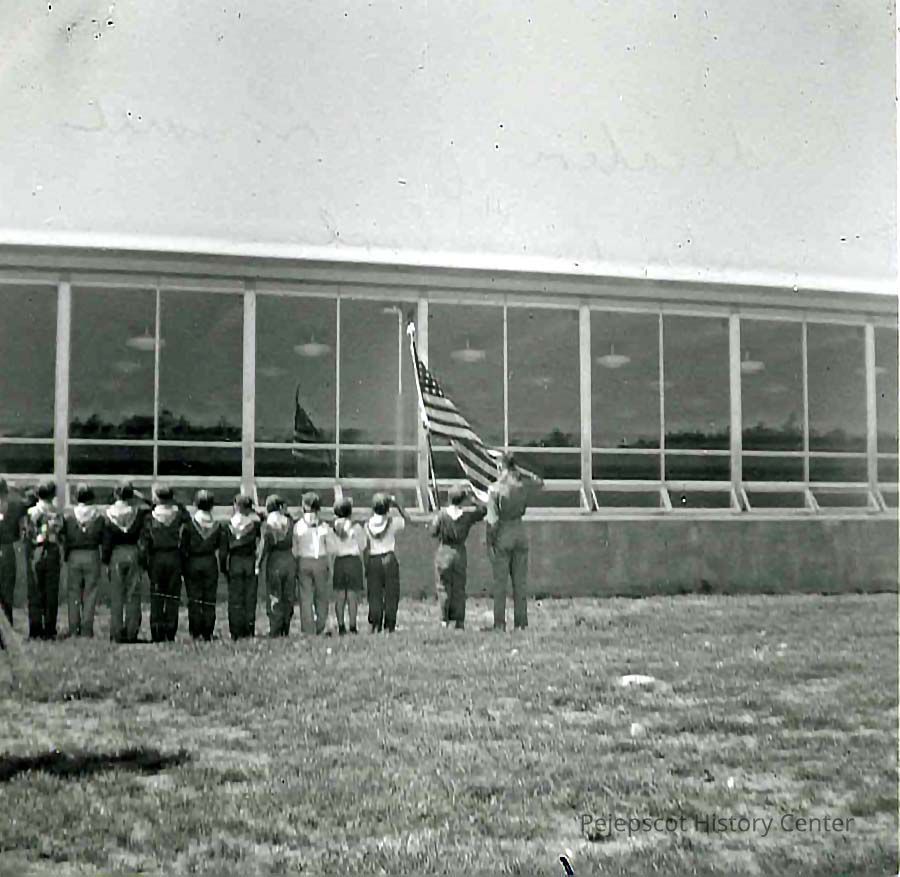 An undated B/W photograph of the dedication of the Harpswell Islands Elementary School.