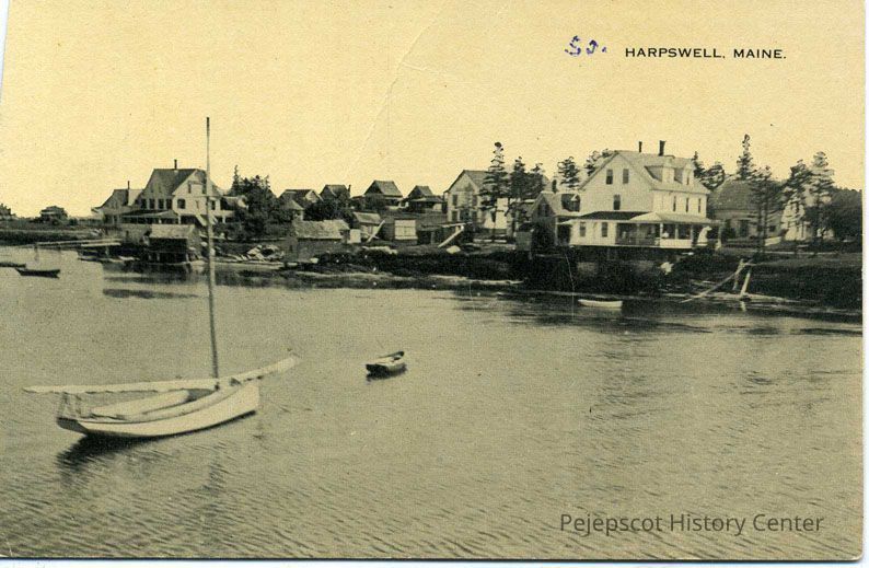 Undated black and white postcard of South Harpswell, Maine, from the water.Lexicon