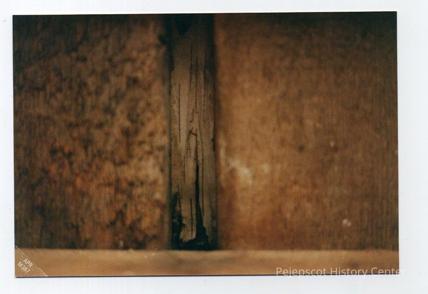 Harpswell Meeting House, birch bark insulation between interior and exterior sheathing. Taken upstairs in northwest corner.