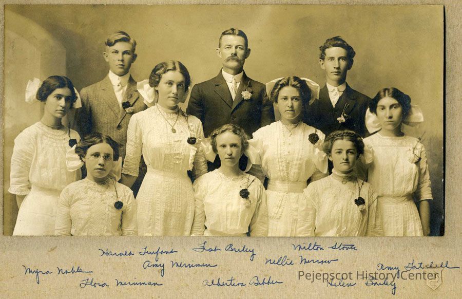 An undated black and white photograph of ten Harpswell young adults, 3 men and 7 women. The men are in suits and the women in white dresses; each is sporting a flower. The names of the individuals are written in pen on the bottom margin; not all of the names are fully legible.