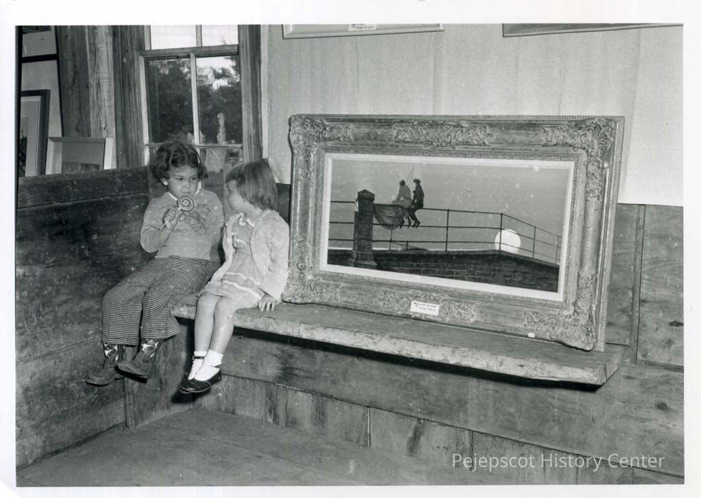 A black and white photograph of two children sitting by a painting in the Old Meeting House at Harpswell Center in Harpswell, ME. Other paintings lean against the wall nearby and the cemetery can been seen through the window. The way the children are sat echoes the two people pictured in the painting sat beside them.