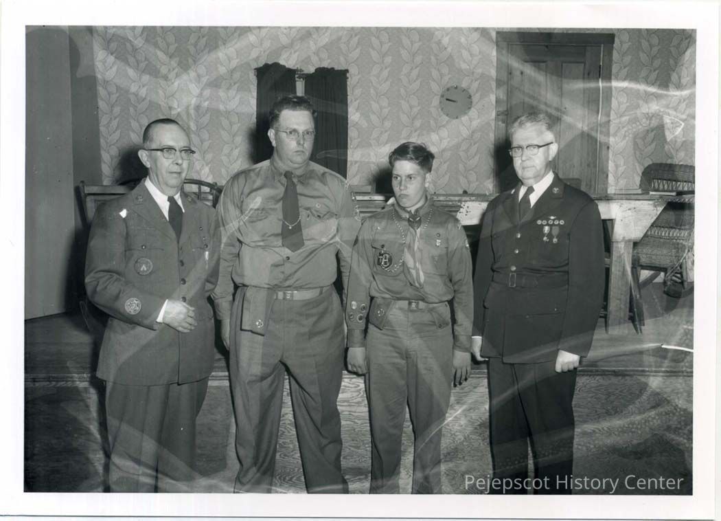 Harpswell scoutmasters pose, in uniform, with the new scoutmaster Edward Birch. Left to right they are Edward Birch, Lawrence Estes, Lawrence Ward, and Archie Holmes.Lexicon