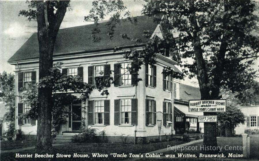 A black and white postcard shows the Harriet Beecher Stowe House on Federal Street in Brunswick, Maine. It is postmarked 4/8/1944.Collection
